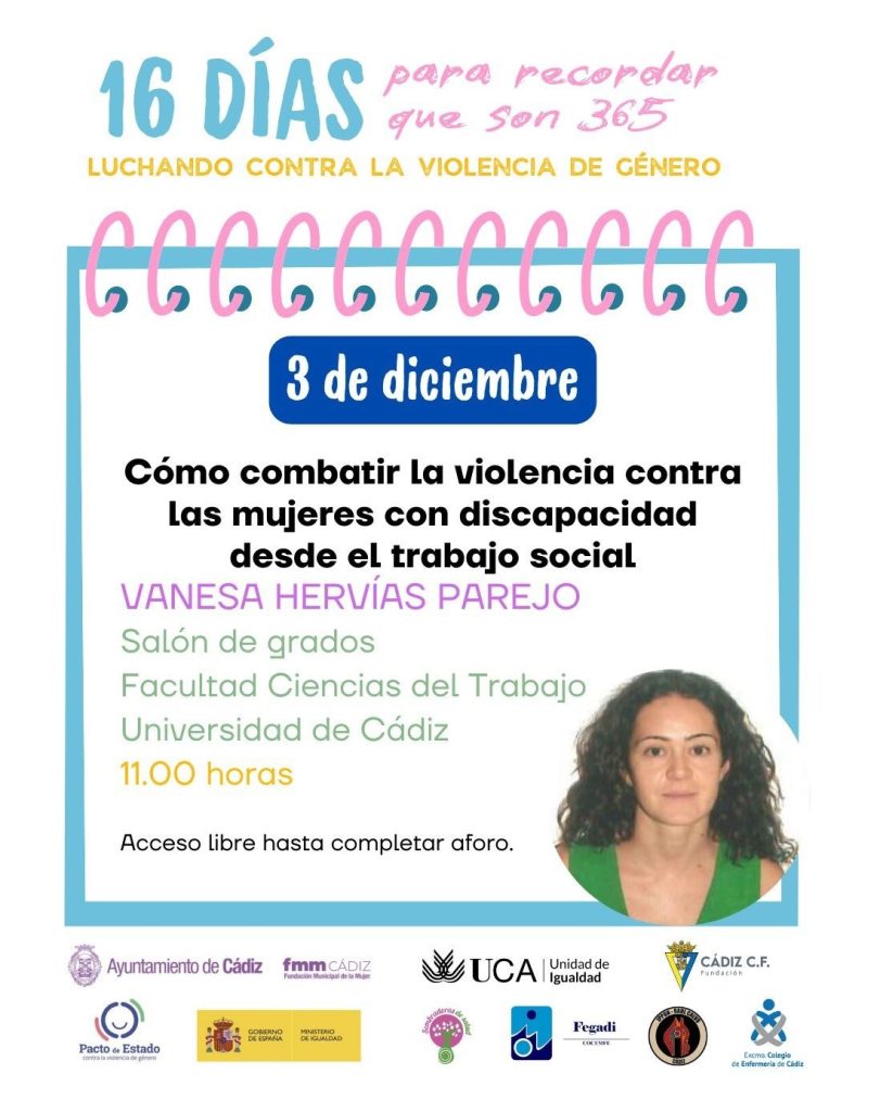 La Fundación Municipal de la Mujer del Ayuntamiento de Cádiz, en colaboración con la Dirección General de Diversidad у la Dirección General de Inclusión de la Universidad de Cádiz, presentan la conferencia “Cómo combatir la violencia contra las mujeres con discapacidad desde el trabajo social“, impartida por Vanesa Hervías Parejo.